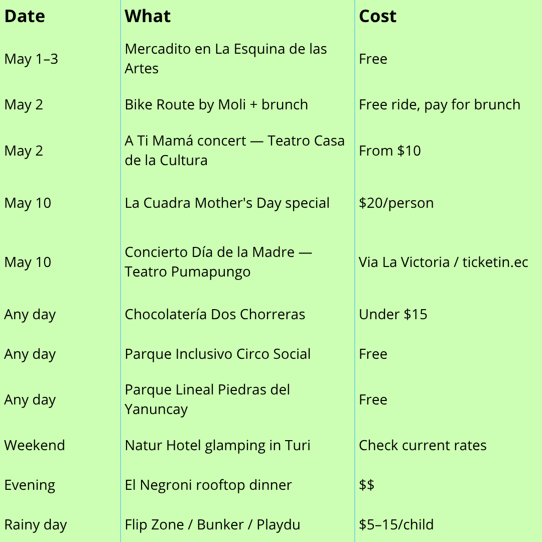 This guide covers everything coming up: the bike rides, the mercaditos, the concerts, and — most importantly — how to survive and thrive during Cuenca's biggest Mother's Day weekend without ending up at the only restaurant in town without a two-hour wait.